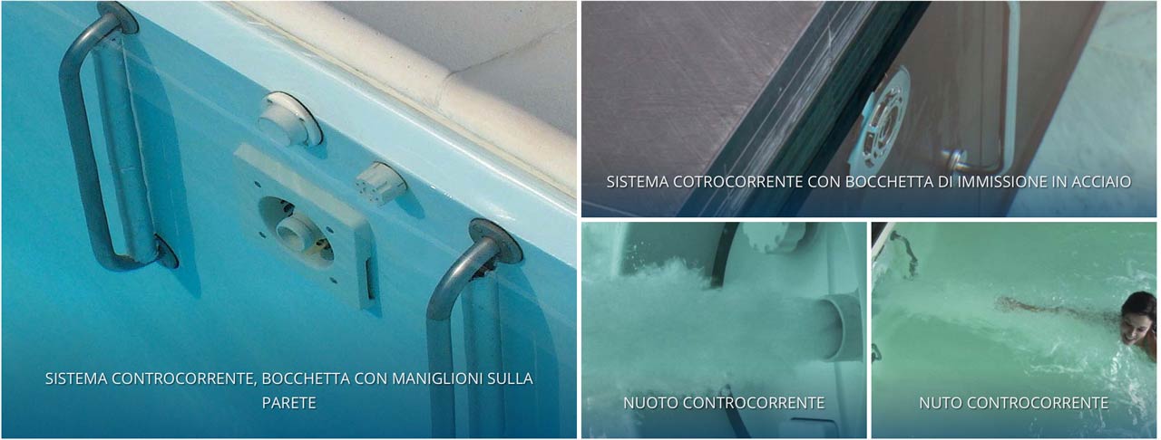 L’impianto del nuoto controcorrente è costituito da una pompa che preleva l’acqua dalla piscina per reimmetterla in vasca con più pressione. A seconda della potenza del flusso d’acqua, programmabile a diverse velocità, il dispositivo può essere sfruttato sia per l’attività sportiva acquatica sia per esercizi idroterapici: è infatti dotato di un sistema di miscelazione regolabile dell’aria, che consente anche di ottenere l’effetto di un potente idromassaggio.